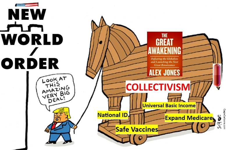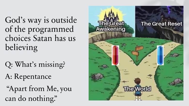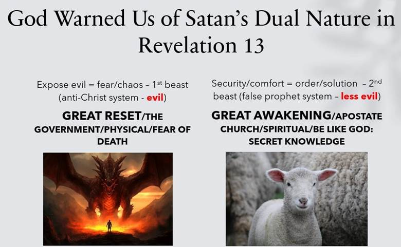 They’ve gotten us to participate in this worldwide psyop because of our desire for the world instead of the One who created it. Few seem to want to acknowledge that God is judging all of us for surrendering our freedom to the state, a dead idol. Instead, they promote “less evil” solutions, selling us on the belief that mortal men can fix a spiritual problem. Their claims of a “Great Awakening” and a “Golden Age” are the false prophet side of the Luciferian trap.